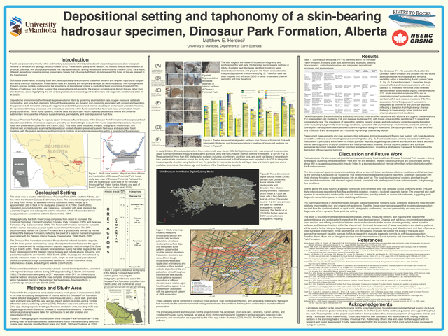 Exceptional soft-tissue preservation in fluvial environments remains poorly constrained due to the dynamic nature of river systems. This study integrates lithofacies analysis, facies associations, and stratigraphic mapping from the Upper Cretaceous Dinosaur Park Formation (Dinosaur Provincial Park, Alberta) to evaluate how point-bar architecture, sedimentary processes, and stratigraphic position may influence the preservation of fossil skin. Results suggest that preservation is stratigraphically clustered and potentially linked to localized depositional conditions within migrating fluvial channel belts.Poster